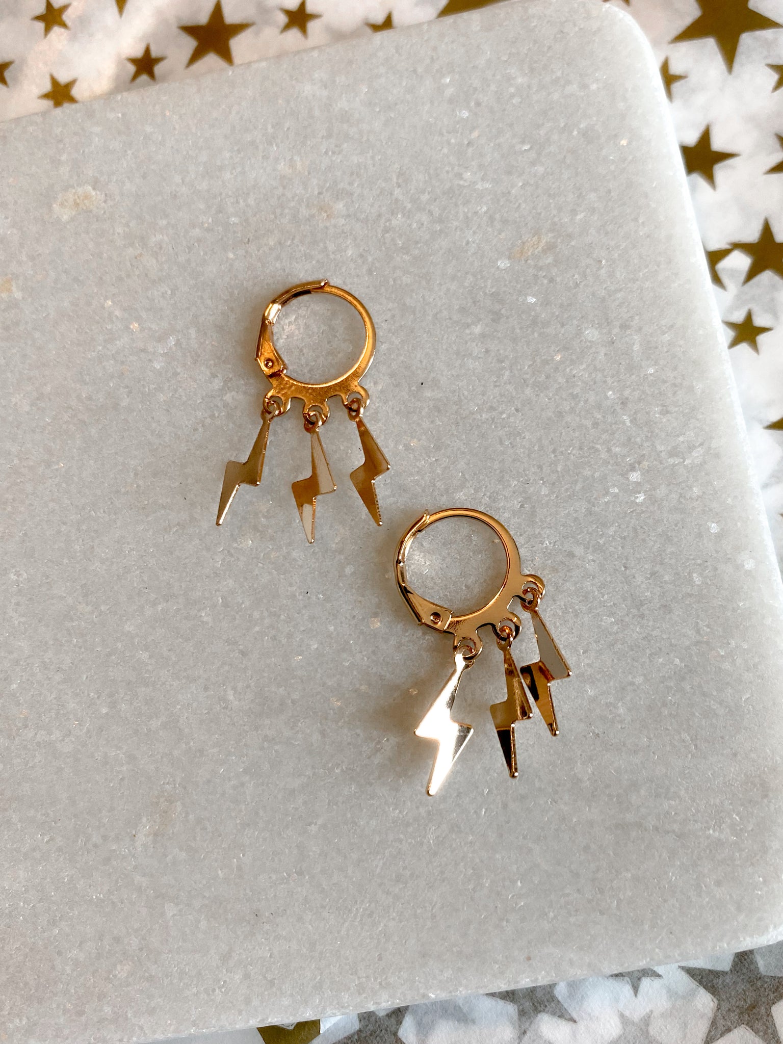 Dainty But Striking, literally! Our huggie style earring set featuring three dainty, dangle lightening bolts.