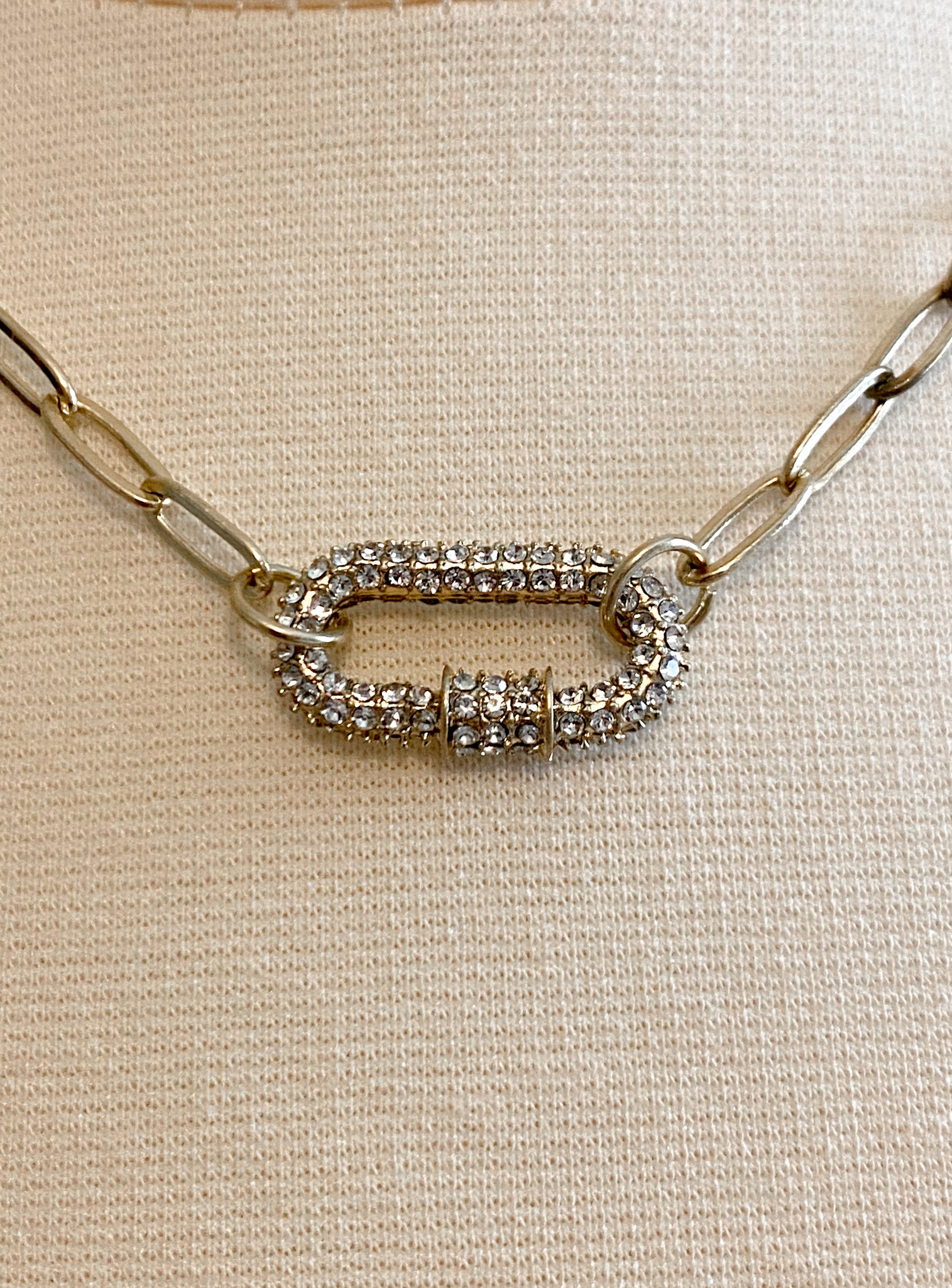 Gorgeous statement necklace featuring dainty chain links throughout and a large rhinestone chain link in the center, for a pop of glam. Adjustable lengths at 17", 18", 19" & 20"