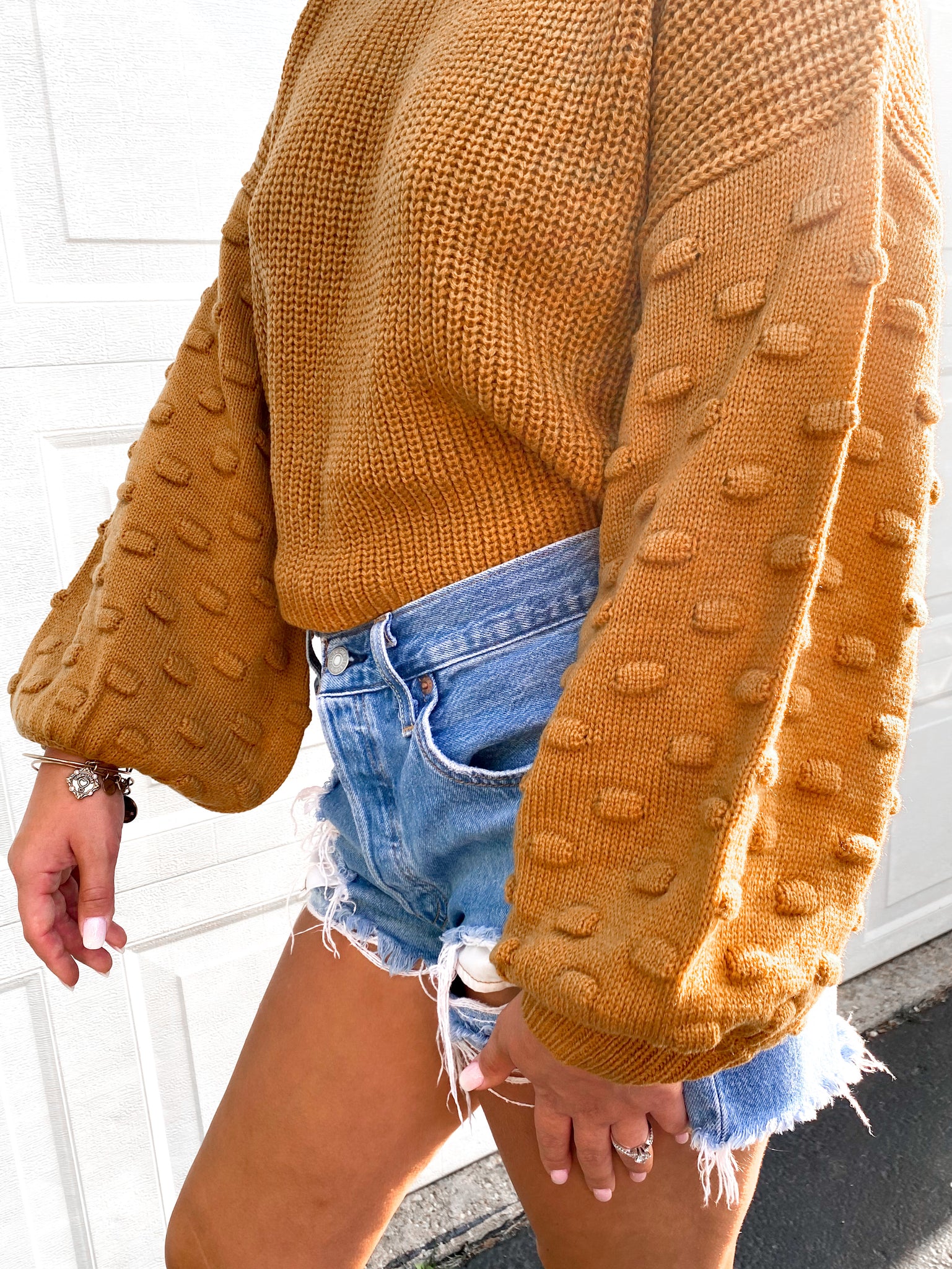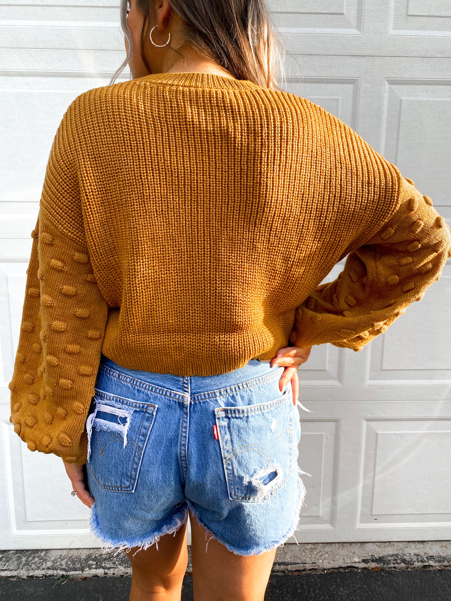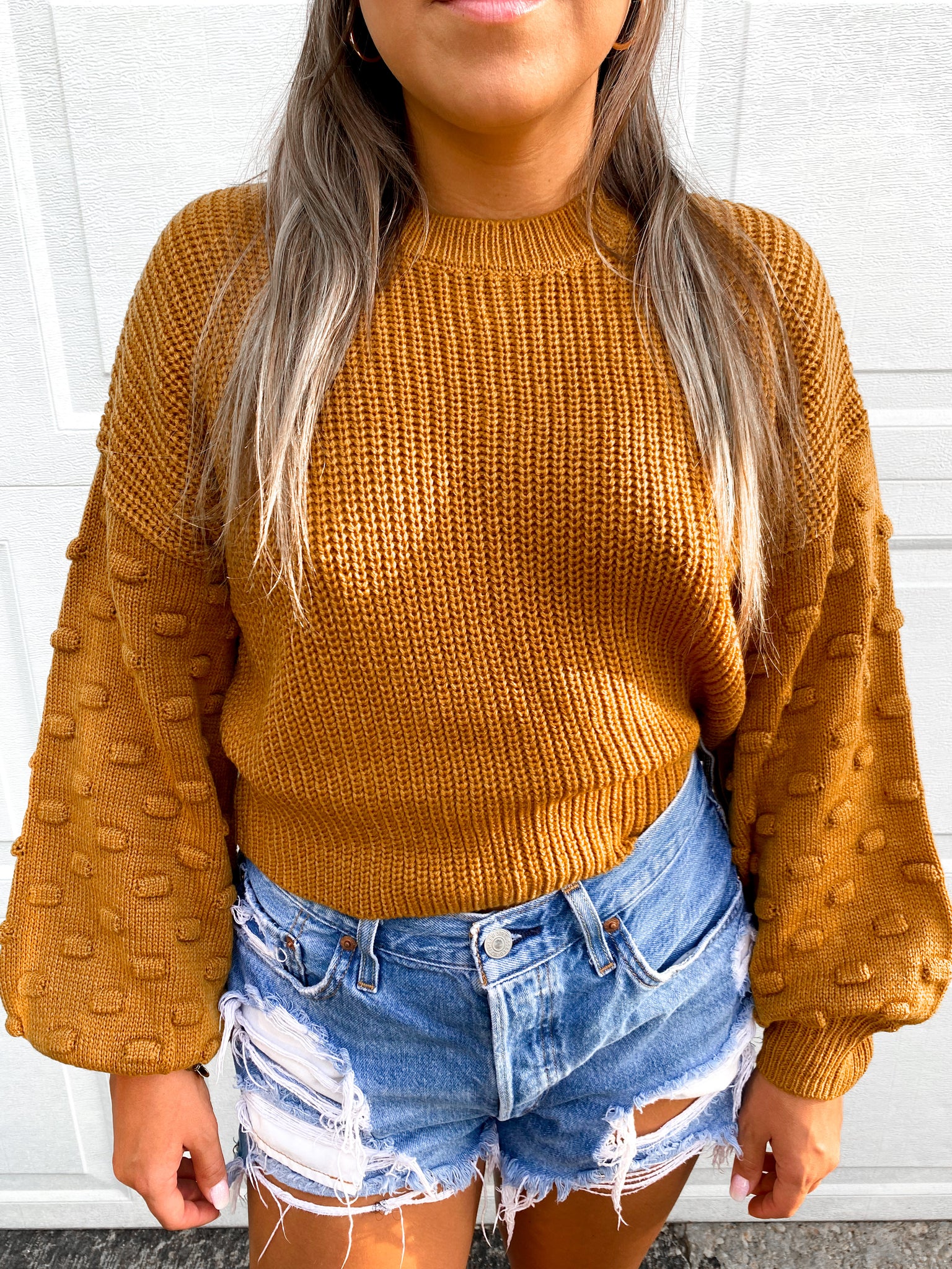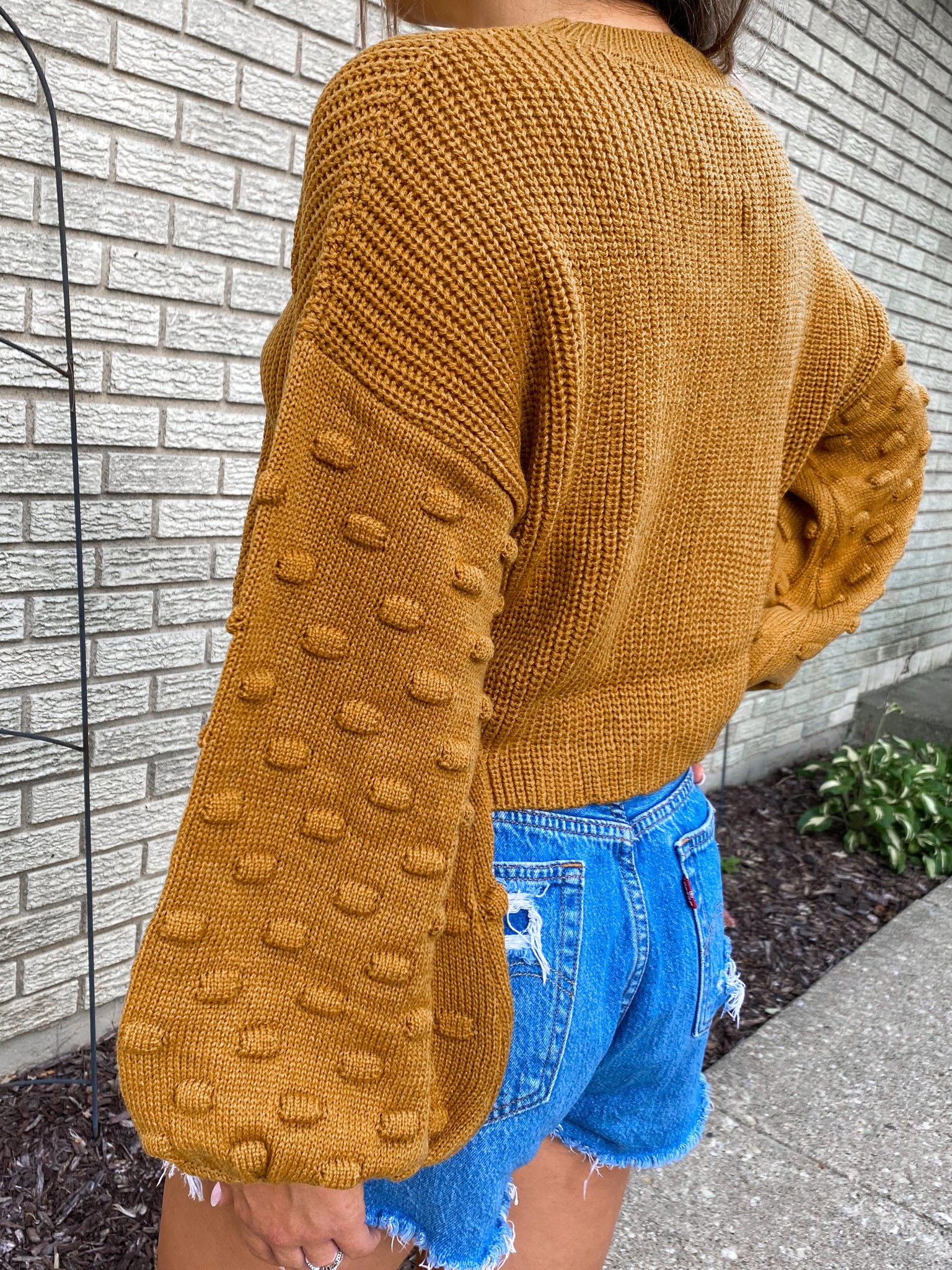 - Adorable balloon sleeve sweater, perfect for the transition season. Featuring little pompoms on the sleeves, for a feminine look. This gorgeous color is a mix of mustard yellow & rust orange.