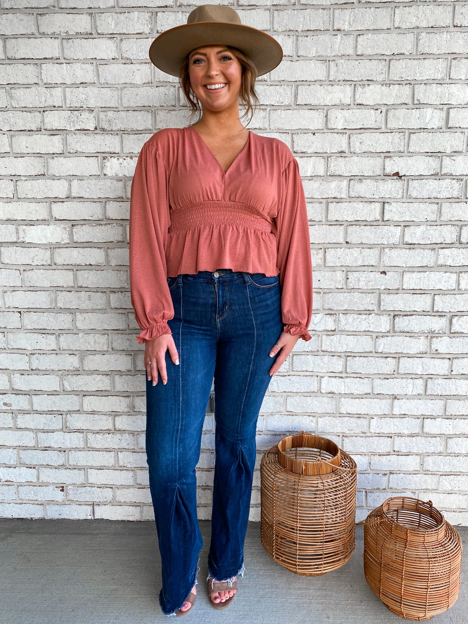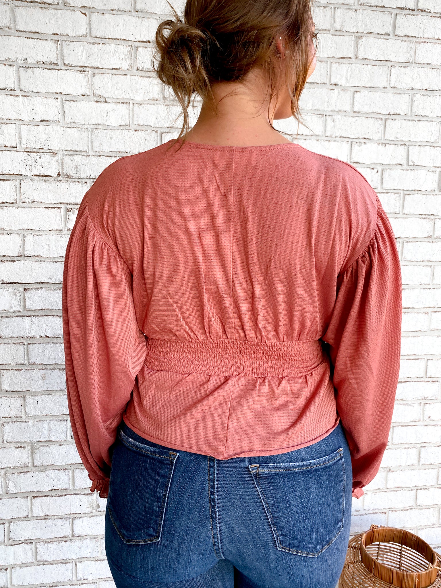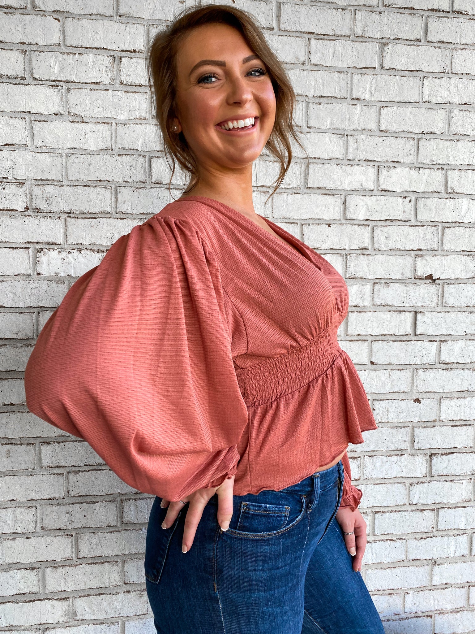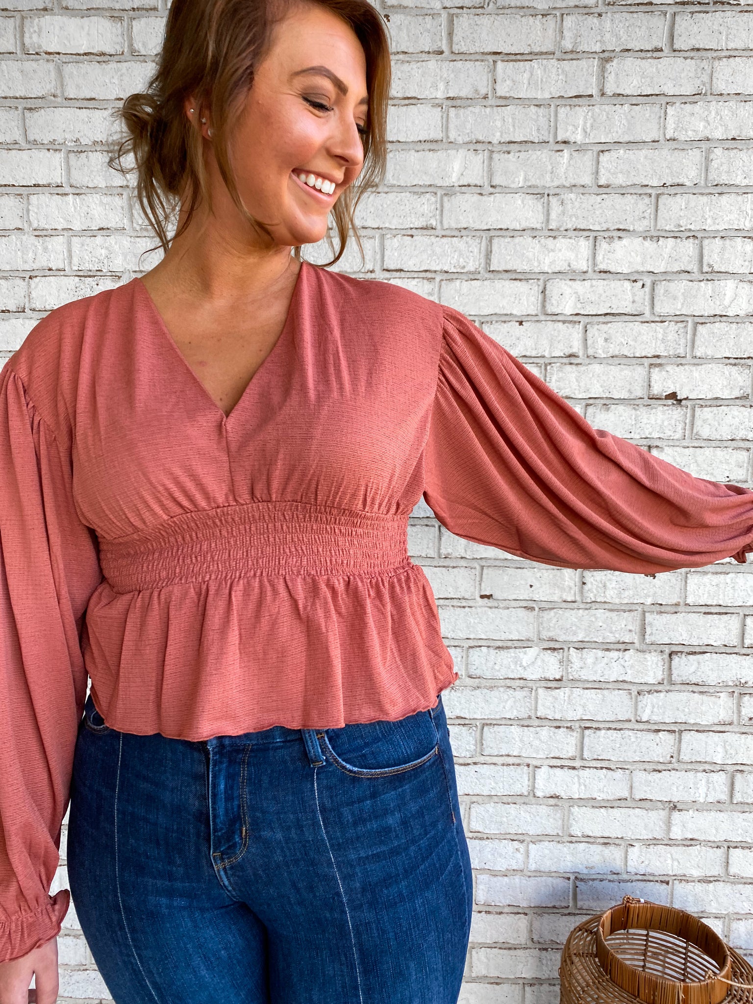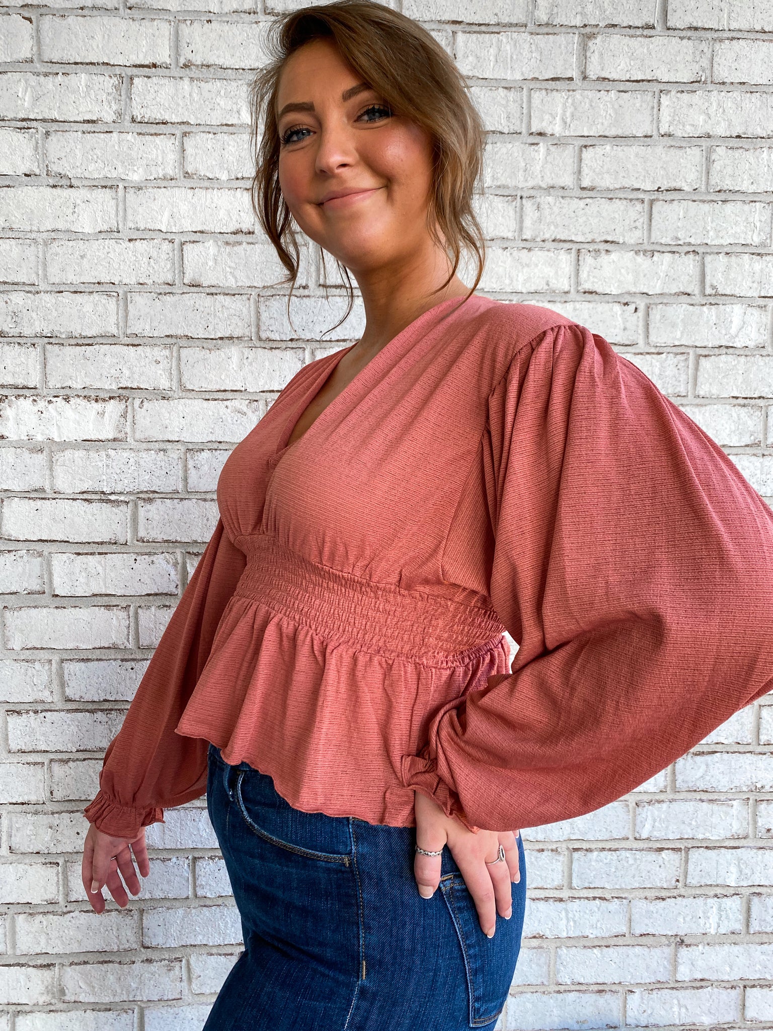 Gorgeous dusty coral top, featuring a flattering smocked waist. Deep, feminine v-neck & trendy balloon sleeves. Stretch material, however recommended to stay with your true size. Model is 5'8" wearing size LG. Materials: Self: 99% Polyester, 1% Spandex...Read more