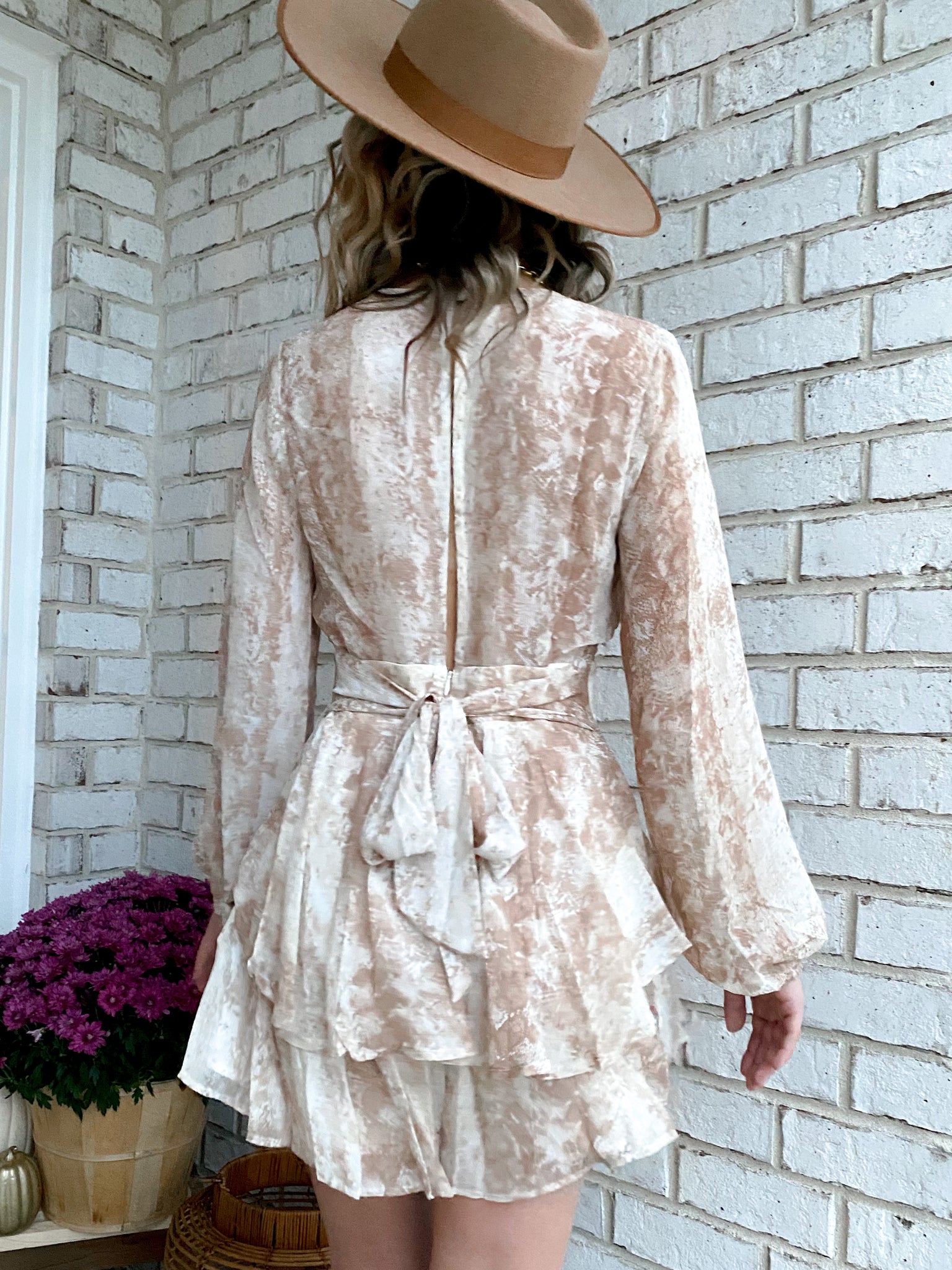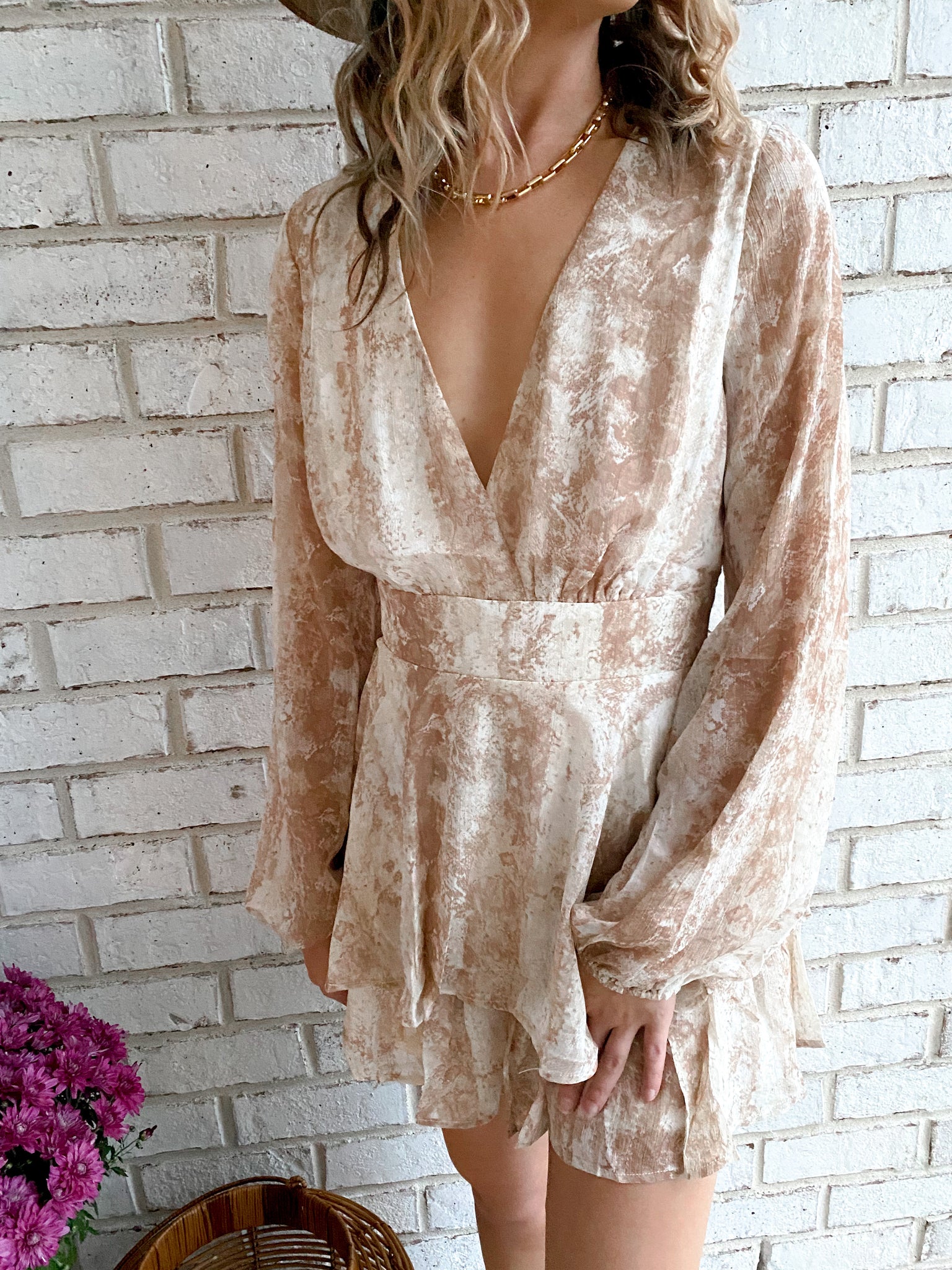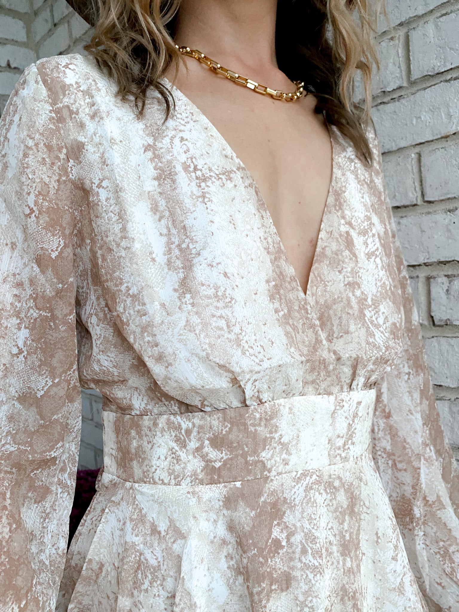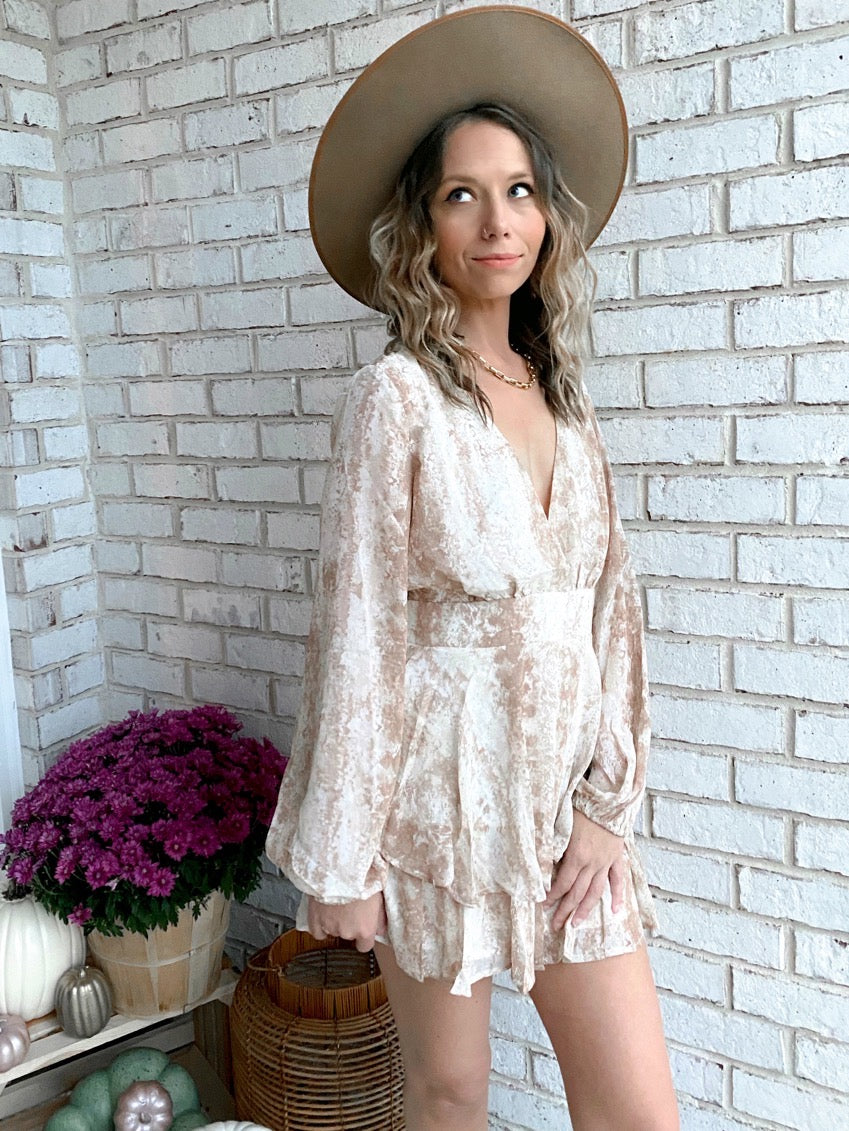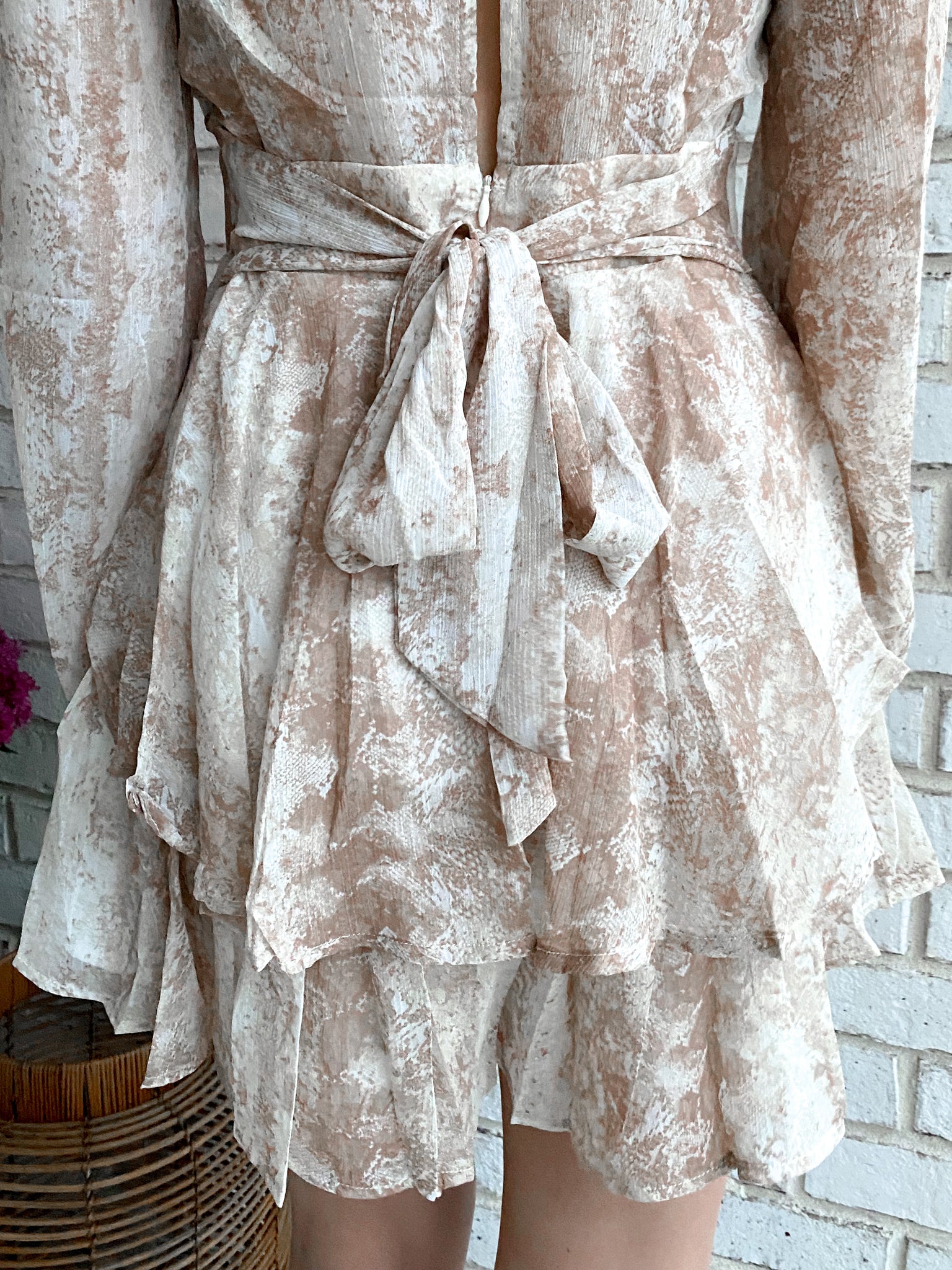 - Gorgeous tiered, flowy, taupe snakeskin print romper. Featuring trendy balloon sleeves, a deep v-neckline & a zipper in the rear.