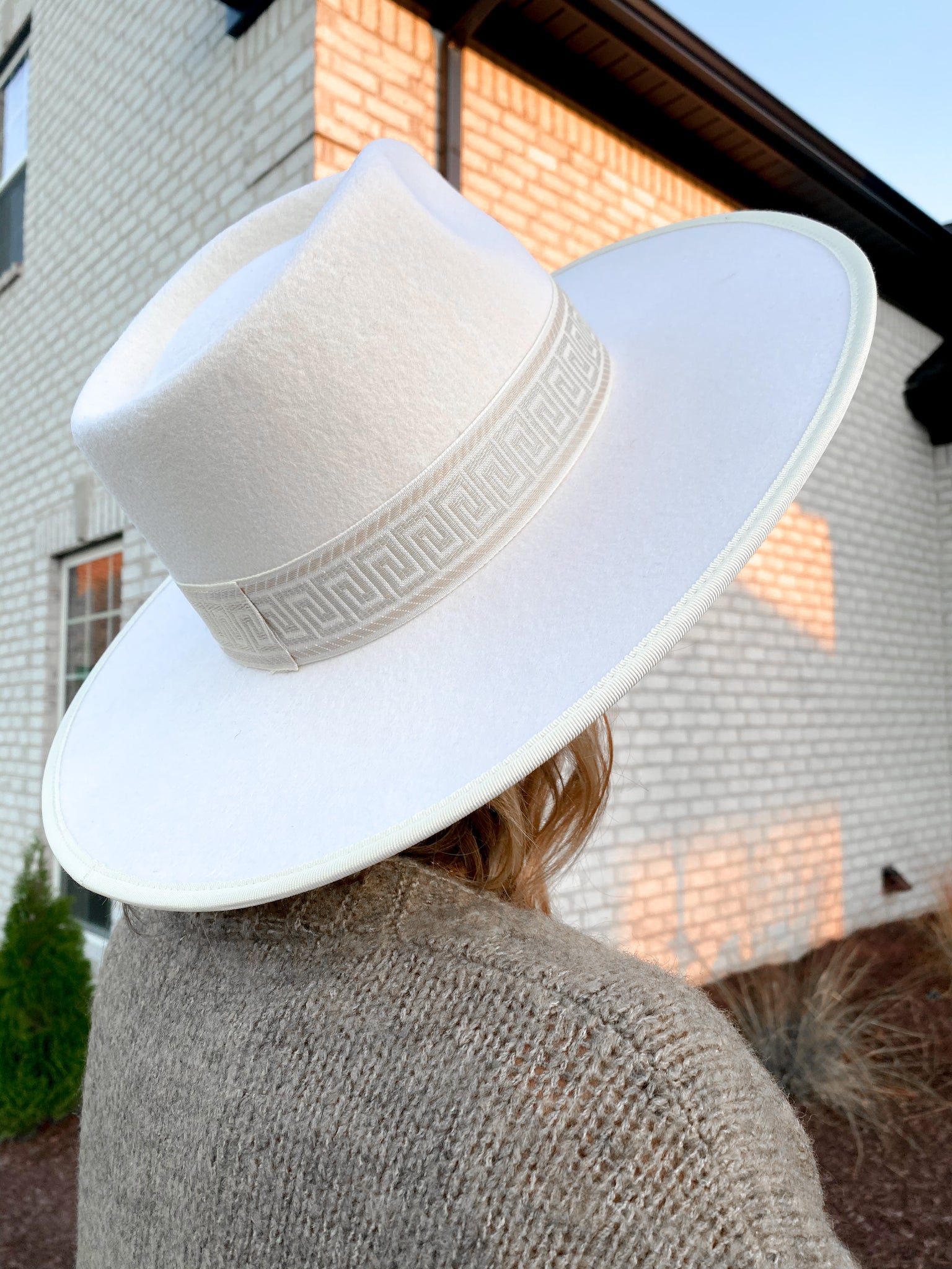 Perfect addition to any outfit! All white, 100% stiff wool, wide brim hat. Features a unique tribal print accent band and pinched crown.
