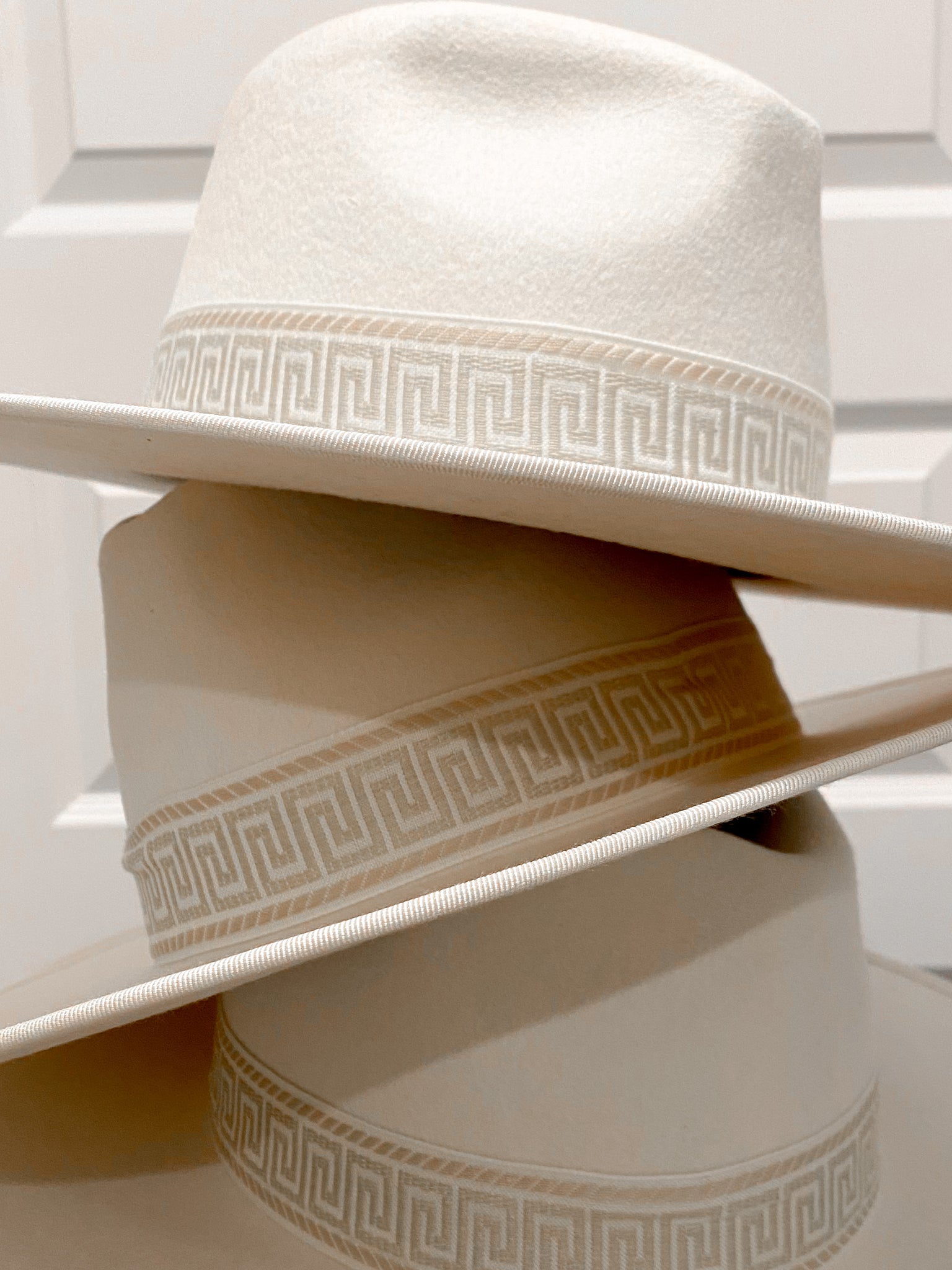 - Perfect addition to any outfit! All white, 100% stiff wool, wide brim hat. Features a unique tribal print accent band and pinched crown.