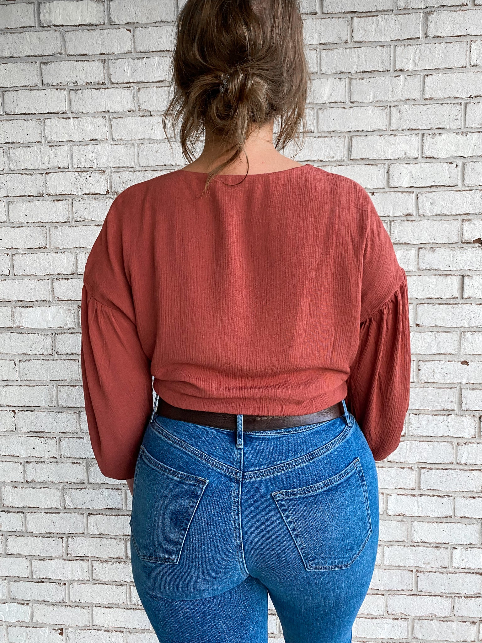 - Ready for Fall in this beautiful brick color bodysuit. 3/4 sleeves with a cut out midsection, to pair with your favorite high waisted shorts or jeans.