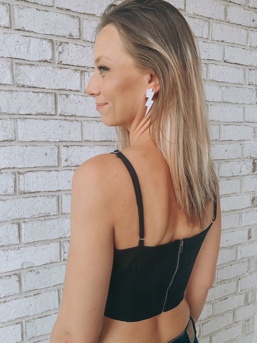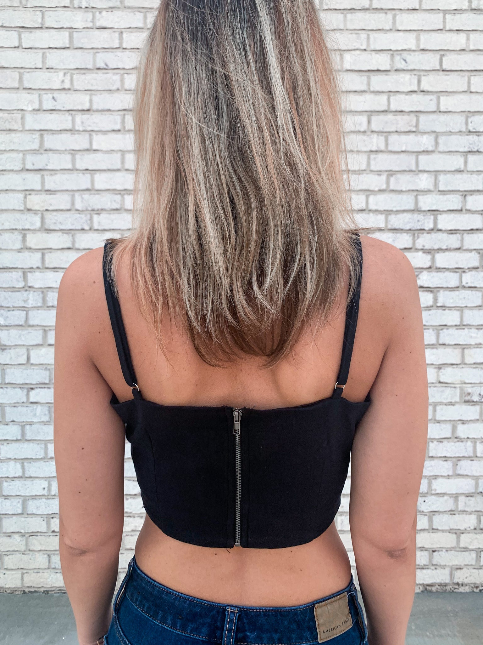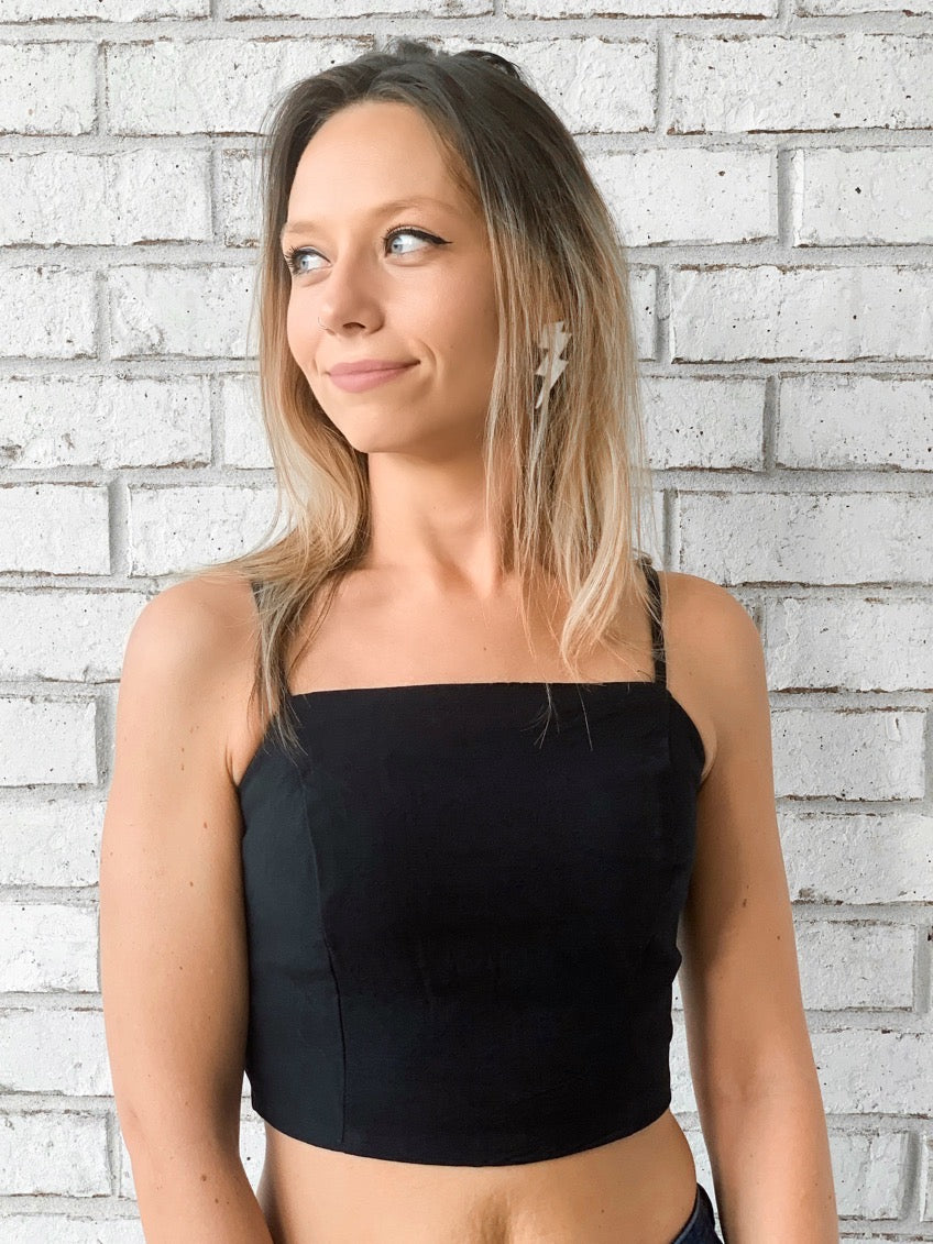 - Flattering & feminine black crop top. Trendy square neck-line. Featuring a zipper on the backside for a comfortable & tailor-made fit.
