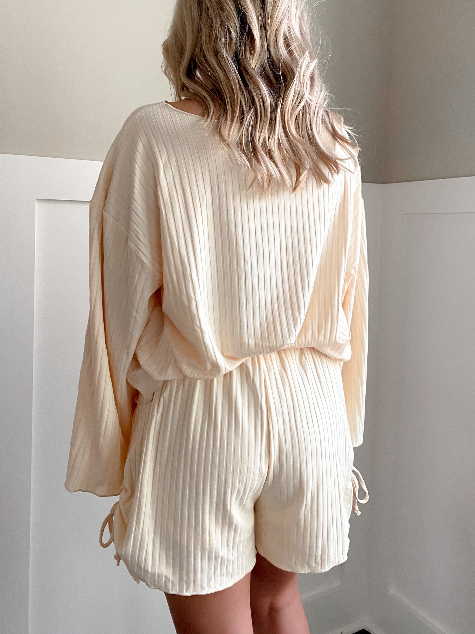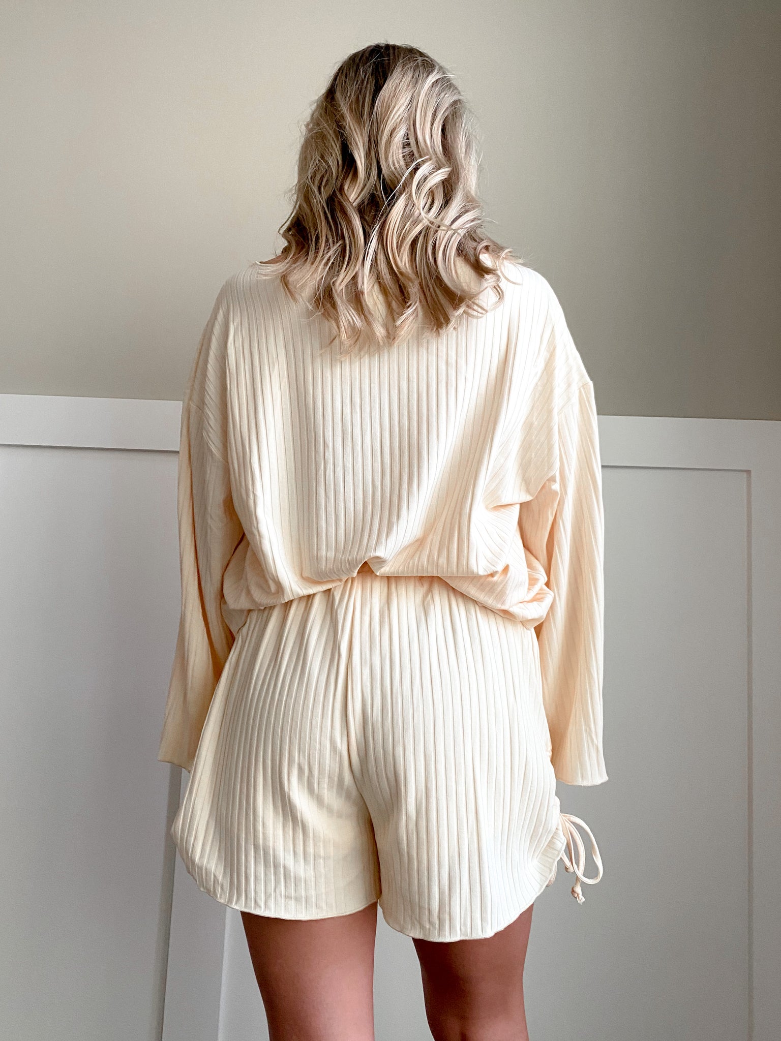 Cozy, ribbed lounge shorts. Featuring drawstrings on both sides & an elastic waist for a comfortable fit. Pair with Sweet Cream Ribbed Top, sold separate. Model is wearing size SM. Materials: Self: 95% Polyester, 5% Spandex Lining: 100%...Read more