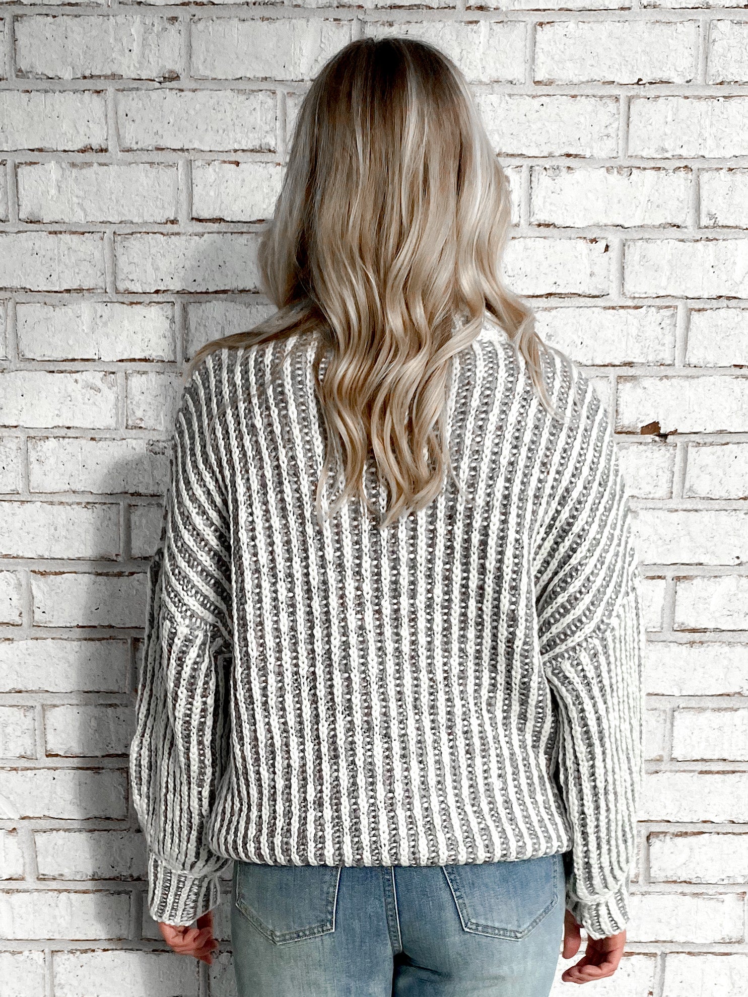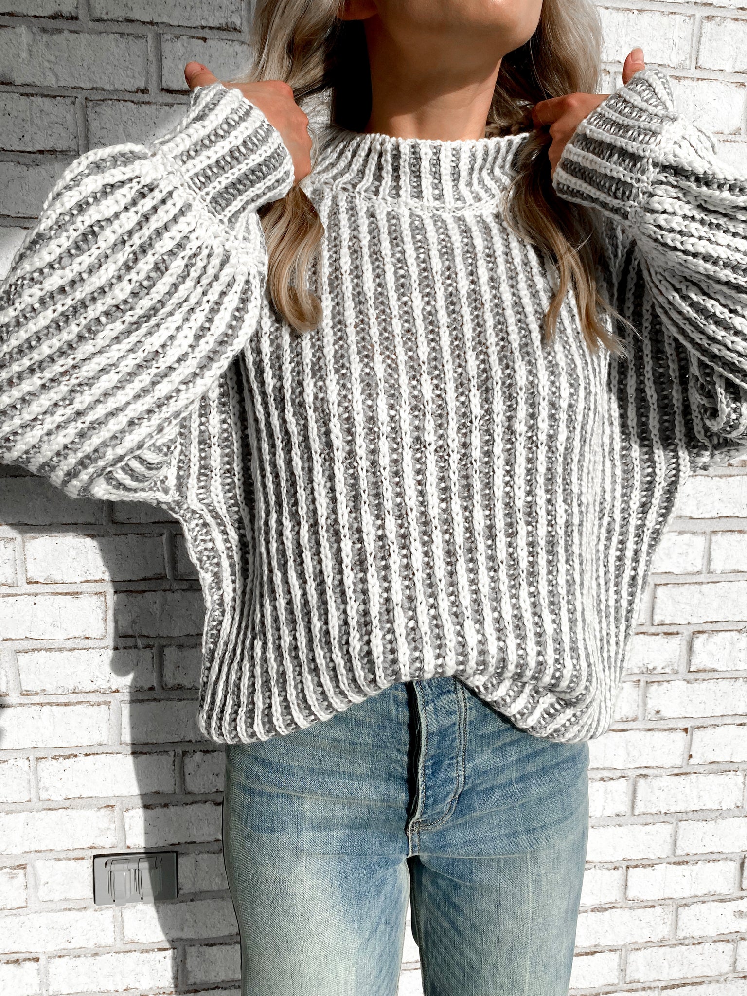 - Sophisticated gray, two-tone sweater. Featuring balloon sleeves with a cuffed wrist & a mock neckline. This is sure to keep you warm through the cooler seasons! Tuck it in, or out, either way this will be your new go-to sweater.