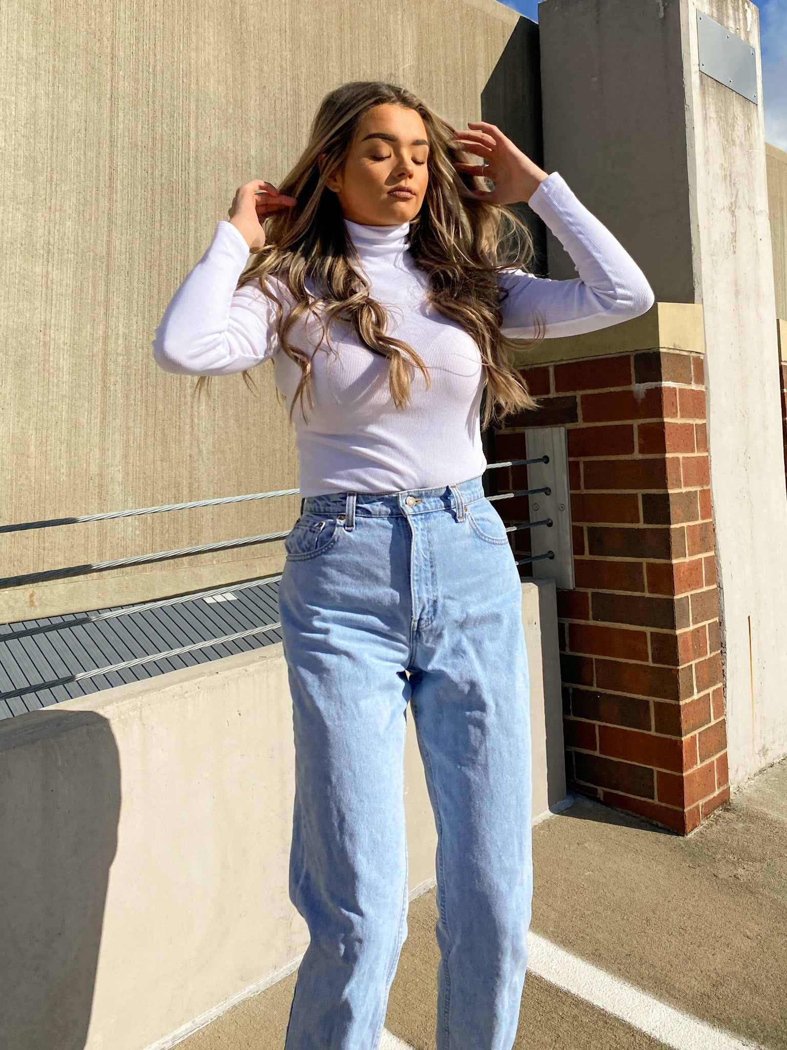 - A closet necessity! Very flattering, white, form-fitting turtleneck. A comfortable, stretchy fabric that can be paired with any outfit.