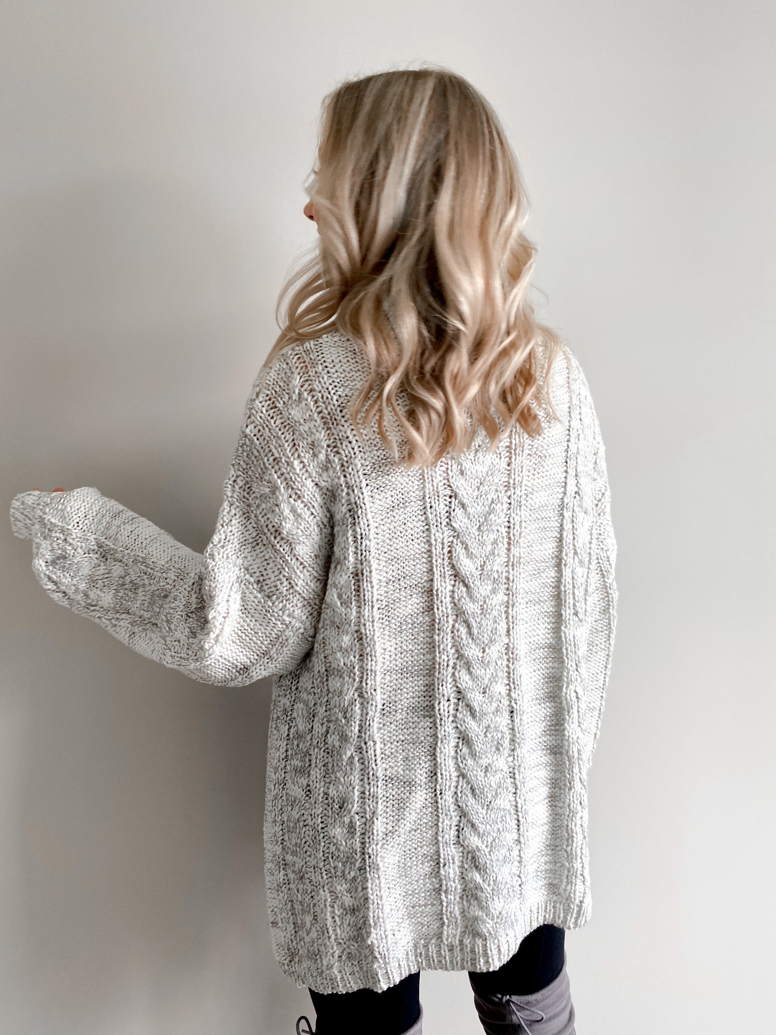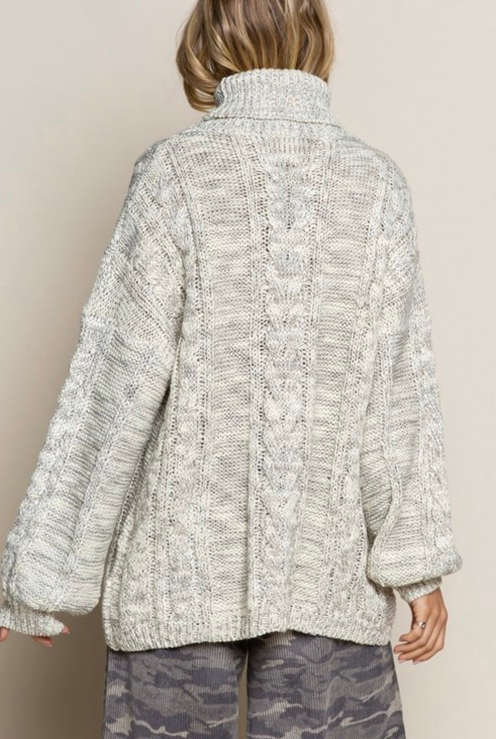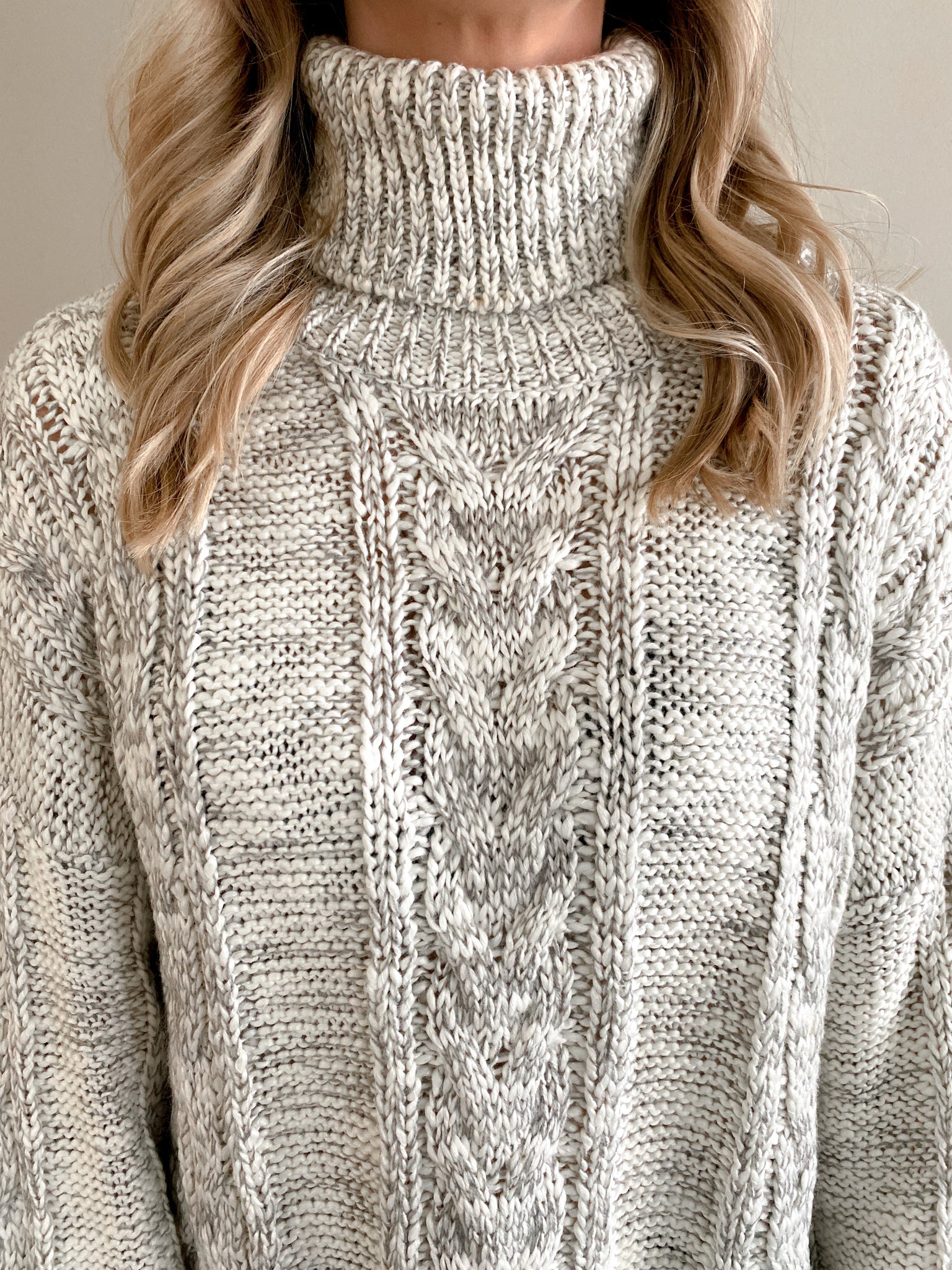 - Make a statement in this gorgeous sweater. With its thick material and quality knitted wool, it is sure to keep you warm all winter. Featuring a trendy turtleneck, cuffed sleeves & two-toned colorway of gray & white. Pairs perfect with jeans or leggings - it will cover your booty!