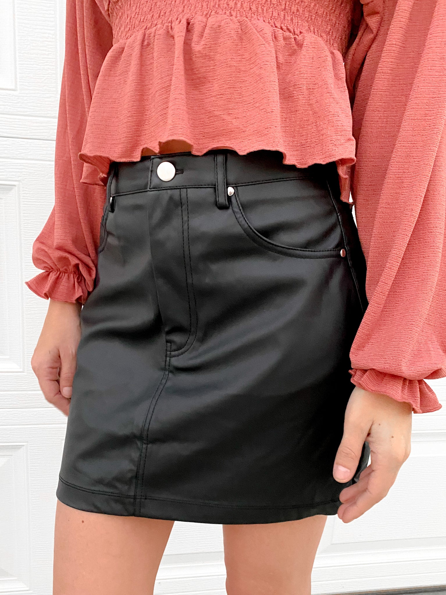 - Right on trend with this gorgeous pleather mini skirt. An absolute closet staple piece, that can be worn from season to season. Slightly stretchy, featuring 5 pockets, belt loops, a zipper & top button. Making this the most efficient mini skirt ever!