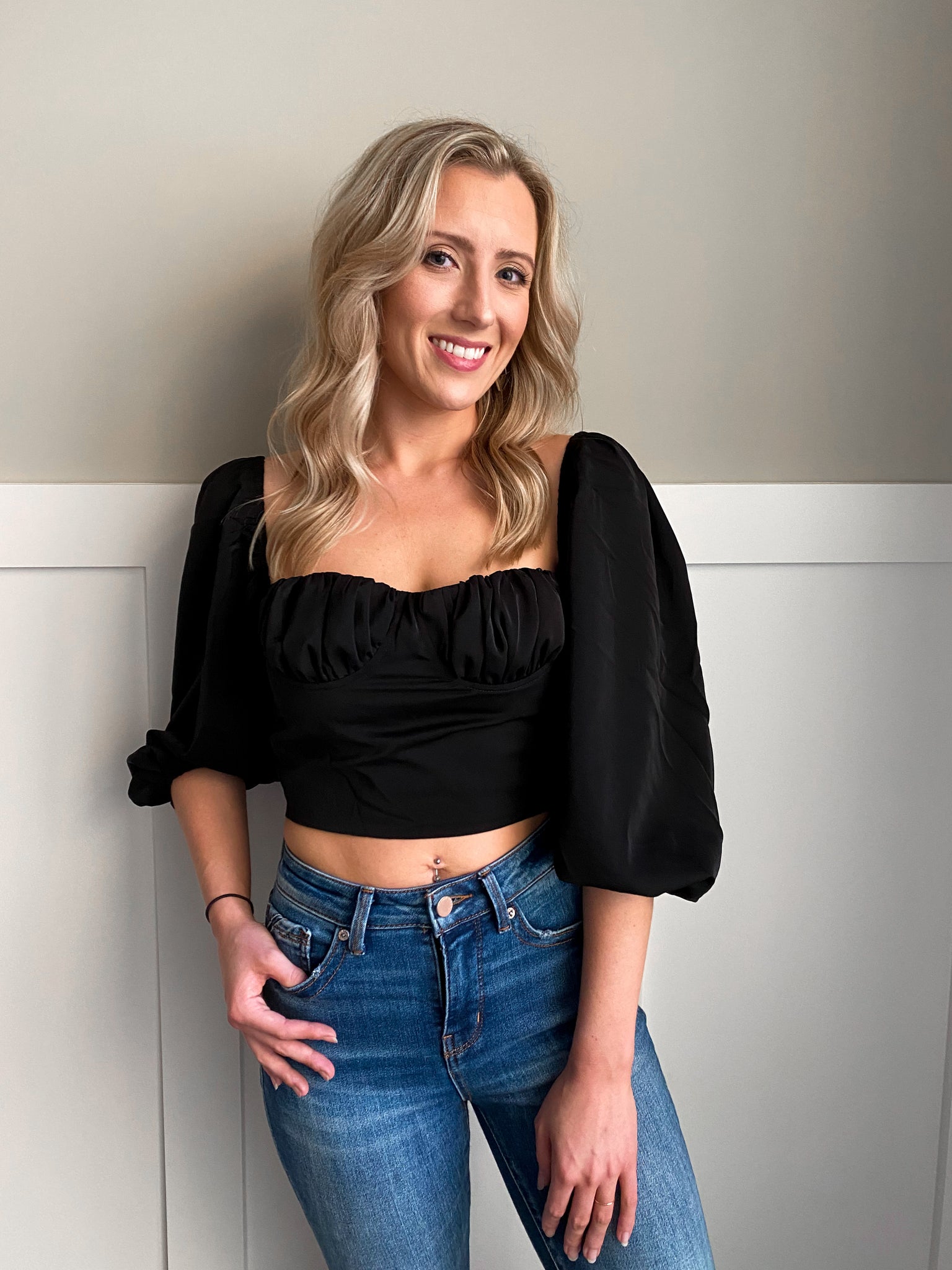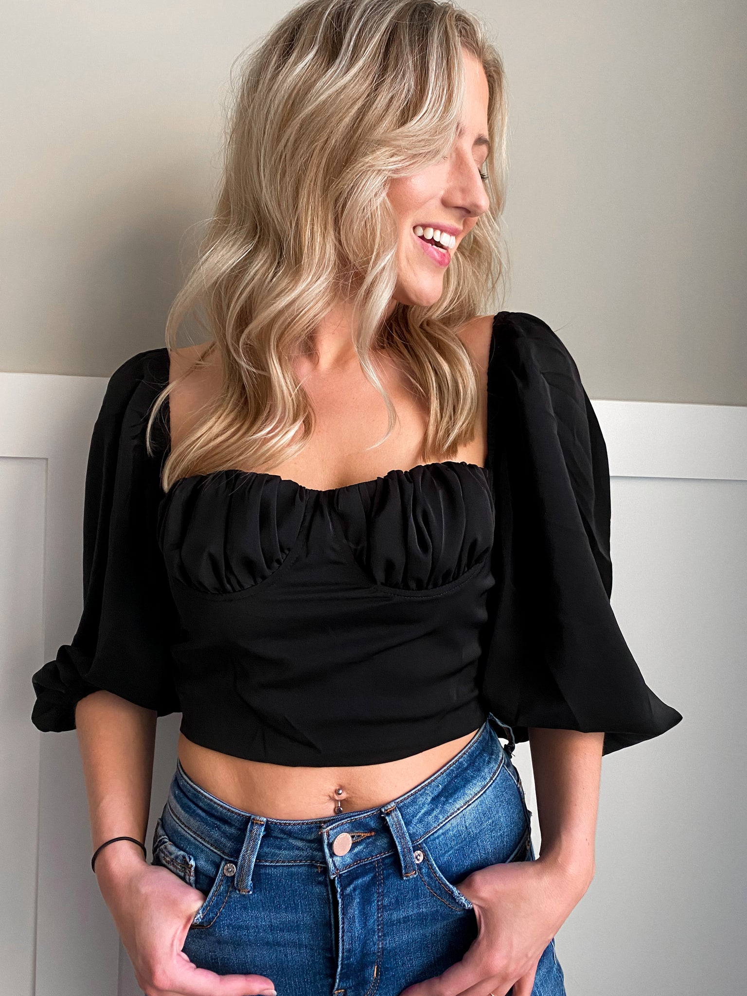 - Head turning, little black top featuring balloon style sleeves & a square-like neckline.